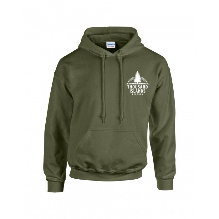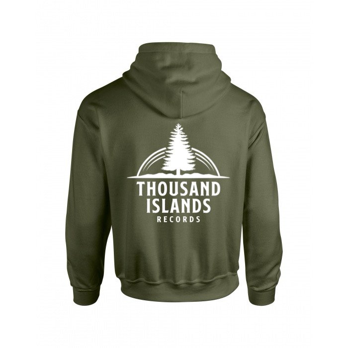 Our Tree logo printed in white on military green hoodie. Front and back placements.